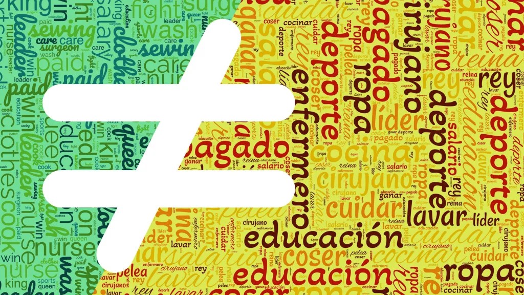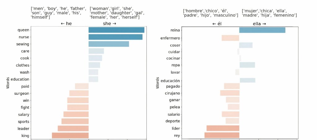 Una lista de 16 palabras en inglés (izquierda) y su traducción al español (derecha) y la similitud de sus embeddings de palabras con respecto a conceptos masculinos y femeninos. Esta figura ilustra que las metodologías para la detección de sesgos desarrolladas para el inglés no son directamente aplicables a otros idioma